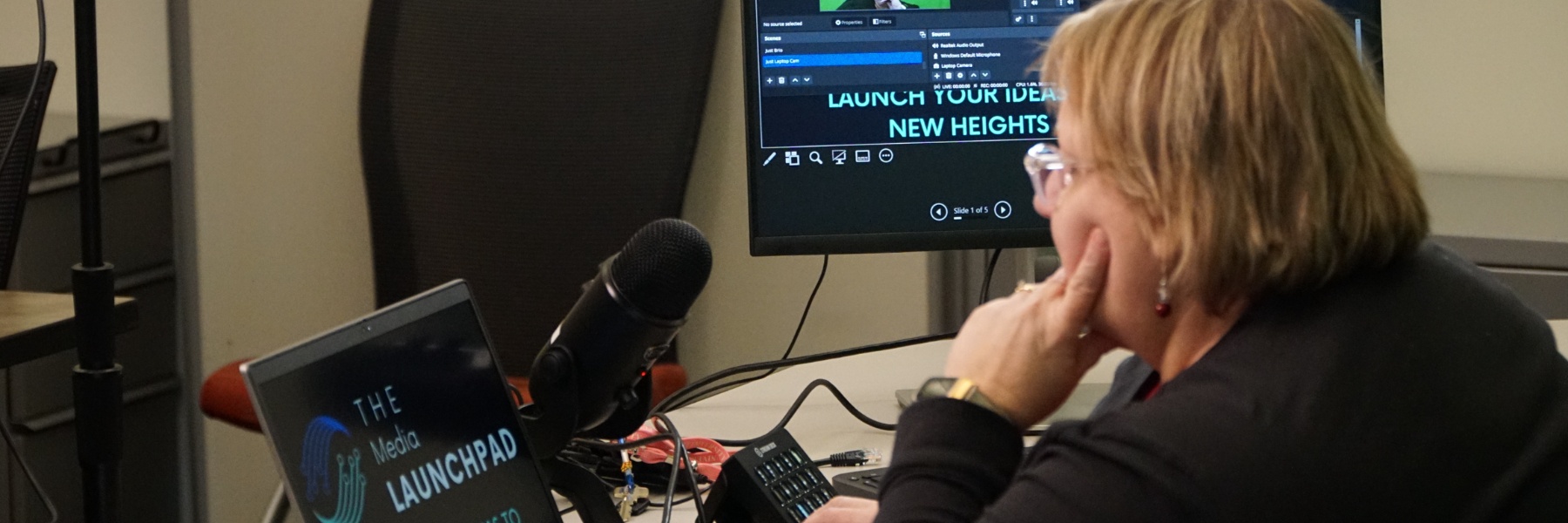 The Media Launch Pad is a self-serve production studio with technology for faculty and students to record multimedia content. The Media Launch Pad is located on the IU Columbus Campus in the University Library.